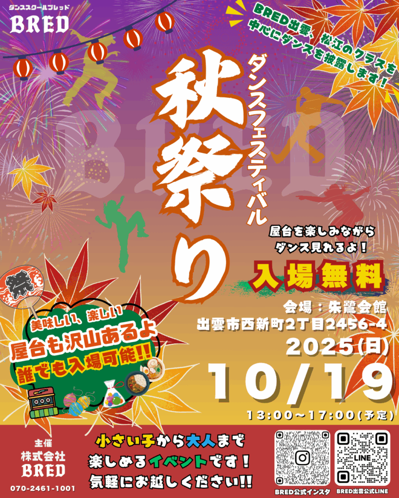 10/19(日)「ダンスフェスティバル秋祭り」開催のお知らせ 2025年10月13日 主 催:株式会社BRED イベント内容:ダンス発表会 フード、子ども縁日などの出店、豪華景品が当たる抽選会 日 時:2025/10/19(日)13:00~17:00予定
